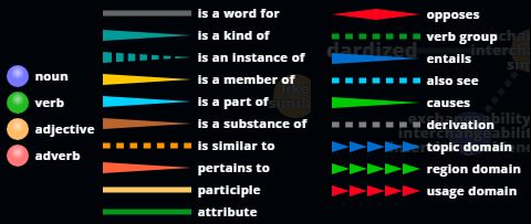 The visual representation below features a number of colors and shapes that will help you understand the term. You can reference this help screen at any time by clicking just below the "V" in Visuwords.